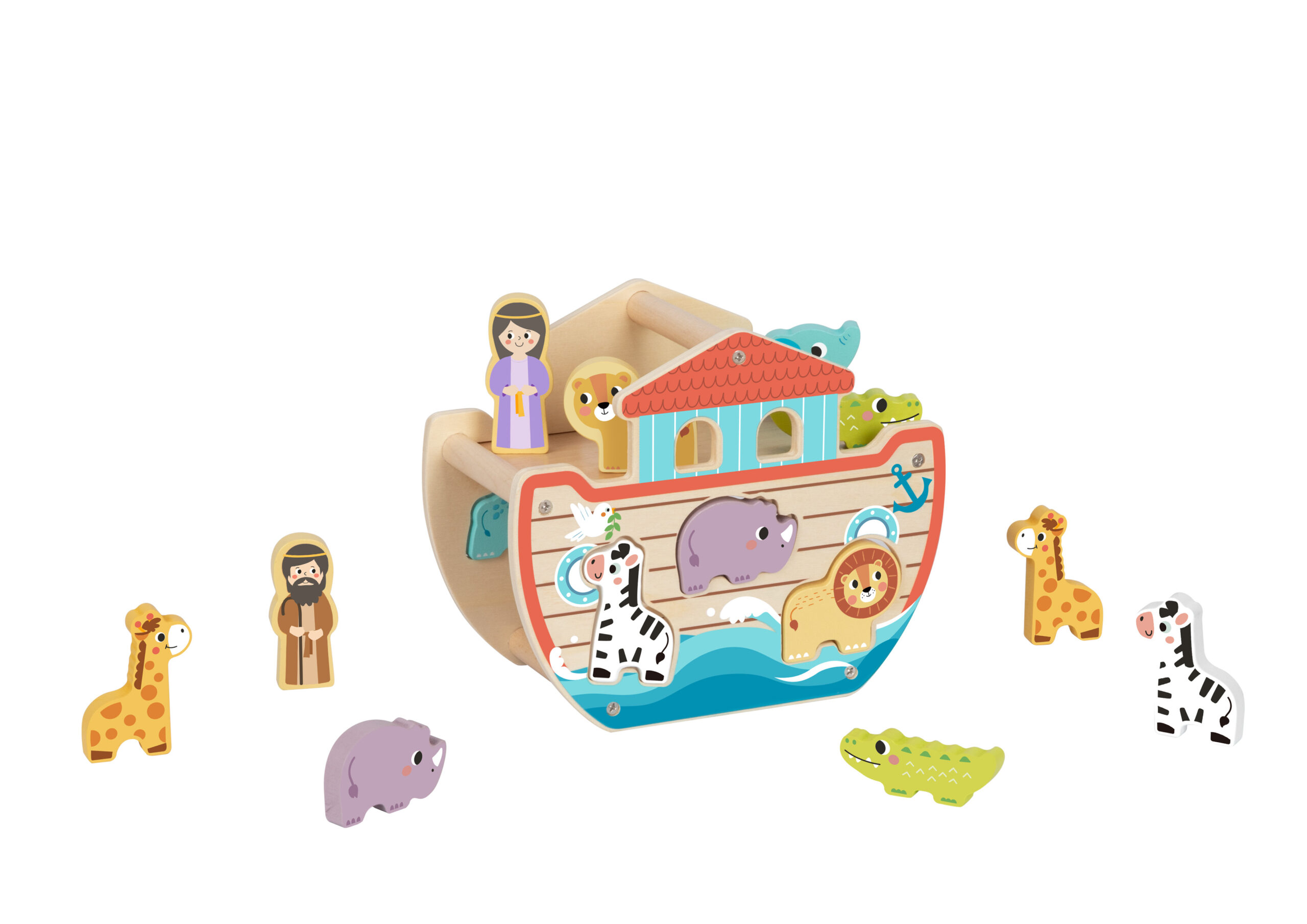 This delightful Wooden Noah’s Ark Playset is designed to inspire imaginative play while promoting fine motor skills. The set features a colourful ark with painted ocean waves, windows, an anchor, and a bright red roof. The open structure includes several cutouts, allowing children to place pairs of chunky, easy-to-hold animal figures like giraffes, zebras, crocodiles, lions, and hippos into their designated spots. Also included are two human figures, Noah and his companion. Perfectly sized for small hands, this toy encourages storytelling, enhances hand-eye coordination, and fosters a love for animals and nature.